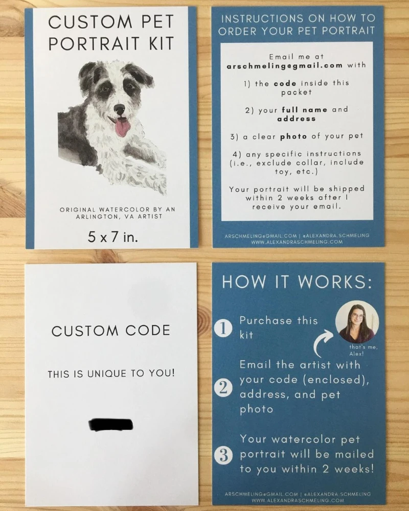 3. The recipient follows the instructions inside to contact Alexandra Schmeling with their name, address, and pet photo.