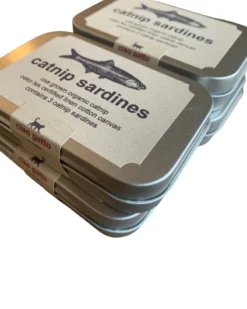 Organic catnip stuffed sardines with USA organically grown catnip. Natural linen cotton canvas printed with pet safe inks in the USA.