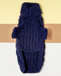 A chunky cable knit design softened for easy everyday wear in 100% natural Alpaca wool. A fold-down Roll Neck add extra warmth for windy winter days, and ribbed knit sleeves held hold body heat in to keep your pup toasty all season long.