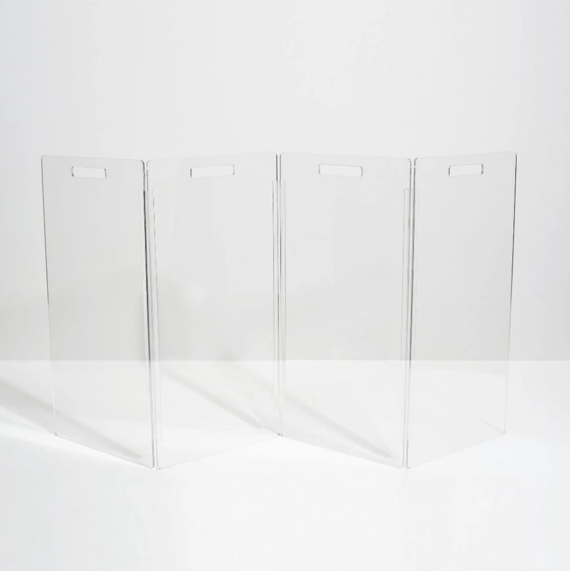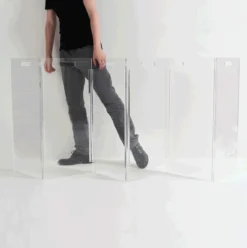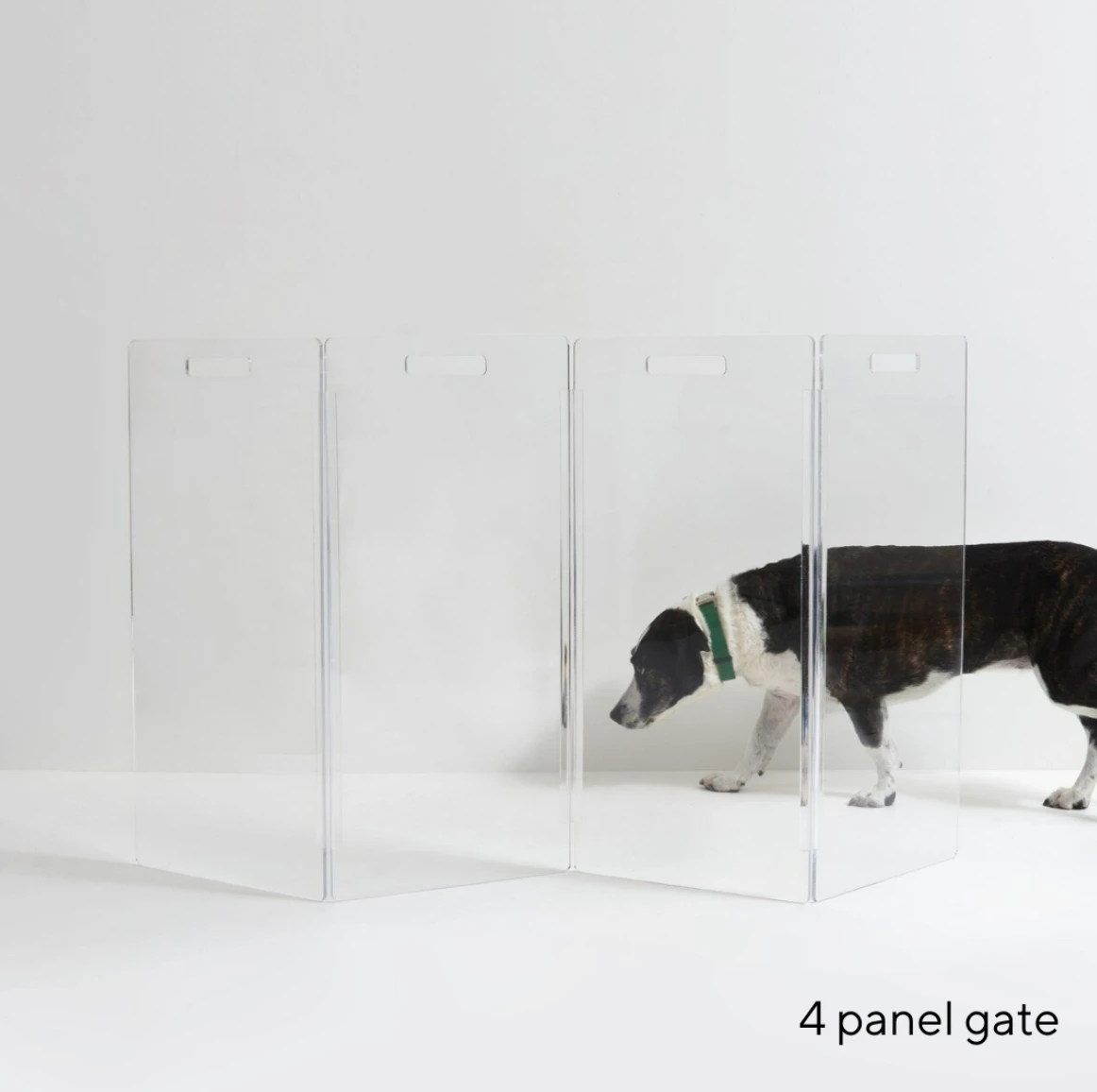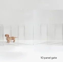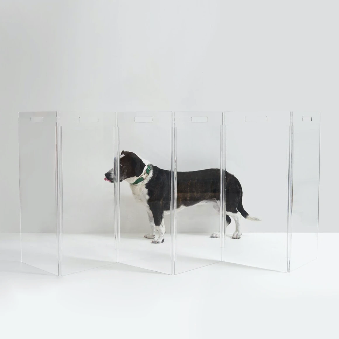 This Clear Acrylic Freestanding Pet Gate Zig Zag is your alternative to the unattractive wood or metal pet gates. This is the only totally clear pet gate/barrier on the market and is handmade in the USA. The folding Zig Zag clear gate is a freestanding, adjustable pet barrier, providing total visibility and style.