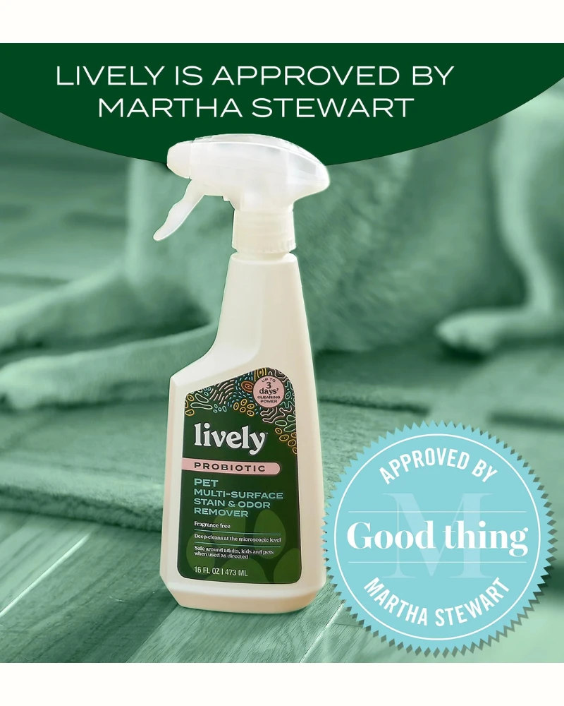 Lively Probiotic Multi-Surface Stain & Odor Remover is a pet care product that can be used on dirt and common pet stains such as urine, feces, and vomit. Good bacteria—or probiotics—are living microorganisms that help eliminate dirt, odors, and bad bacteria at the microscopic level.