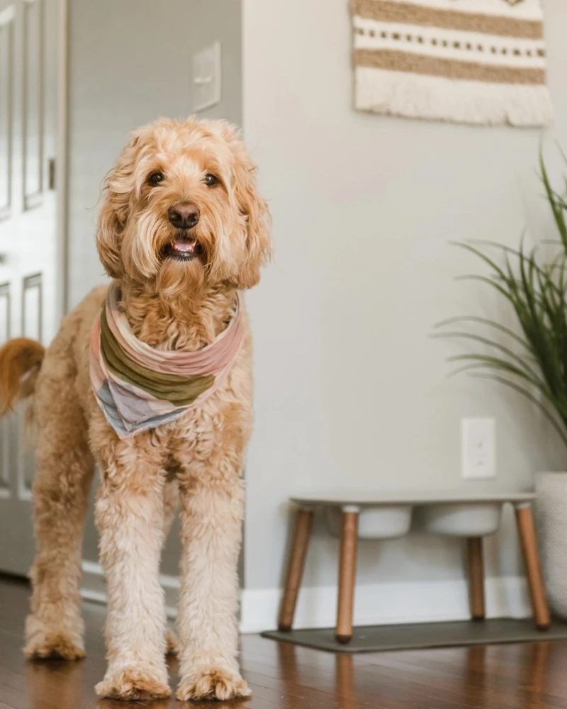 This double feeder by MESSY MUTTS not only accommodates food and water with its 2 stainless steel bowl inserts and contains spills with its wide lip and raised edge border, but it also grows with your dog!