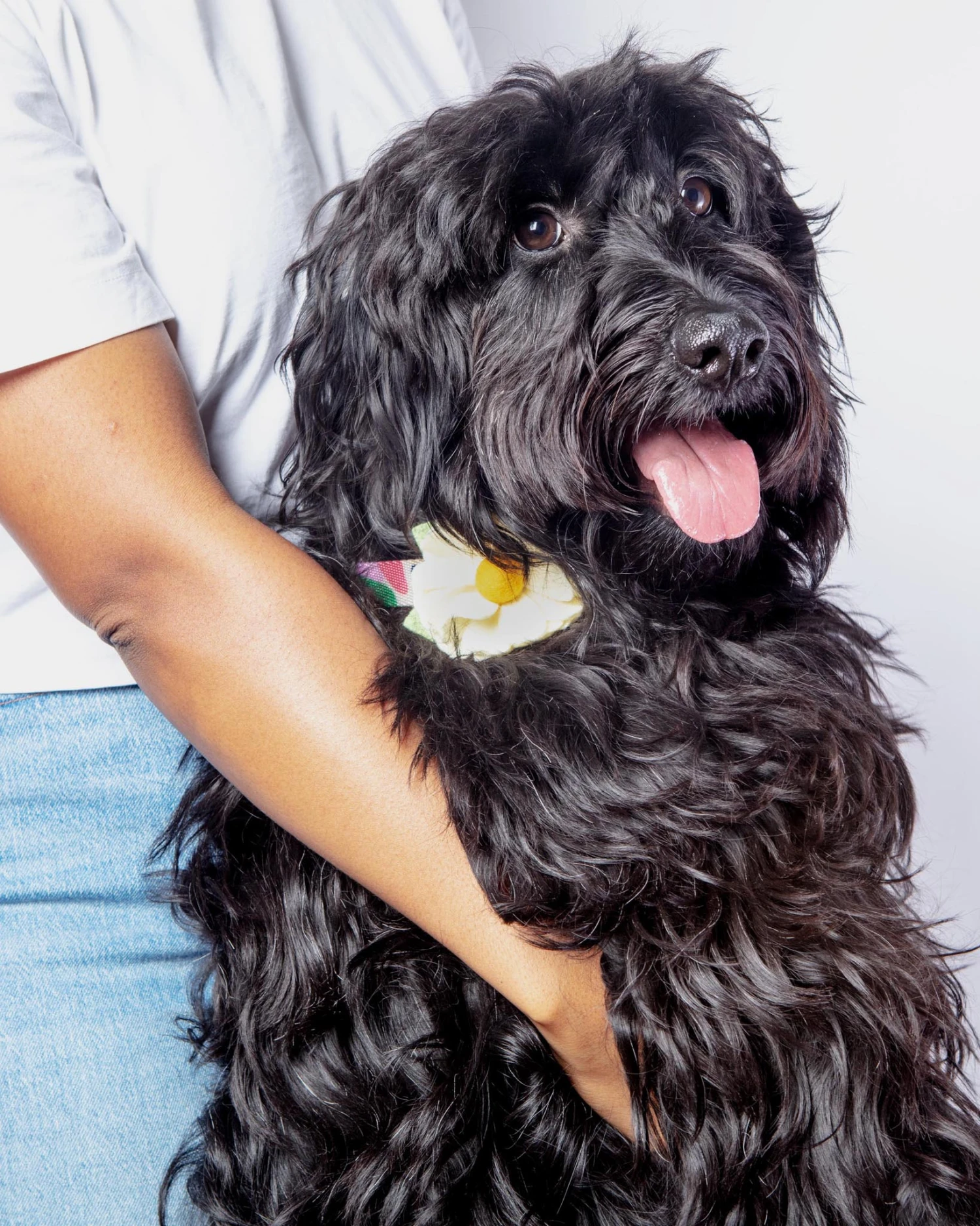 Elastic rings are attached to the flower to secure it to your dog’s collar. Easy to remove, and machine washable.