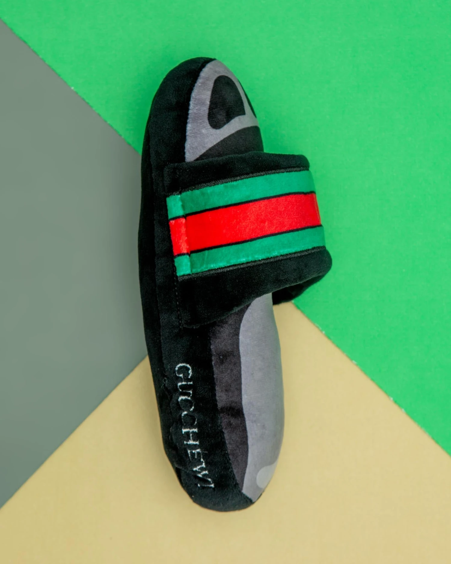 The Gucchewy Plush Dog Toy is perfect for your designer-loving dog. This poly-filled plush toy features a squeaker for extra fun.