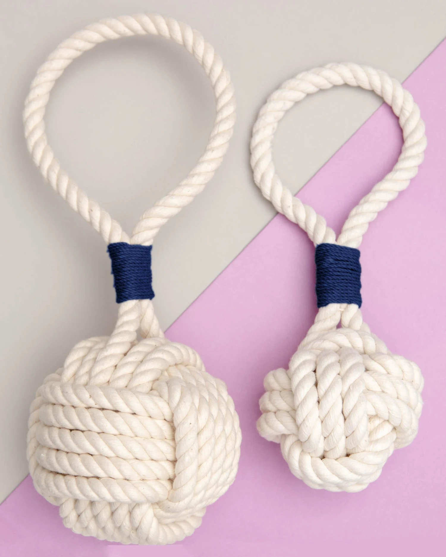 The large monkey fist dog toy is 4″ acroos and is tied around a tennis ball. If your dog loves to swim, it will float! For smaller dogs, we have the smaller one tied around a 1.25″ hardwood ball. Â That one measures 3″ across.
