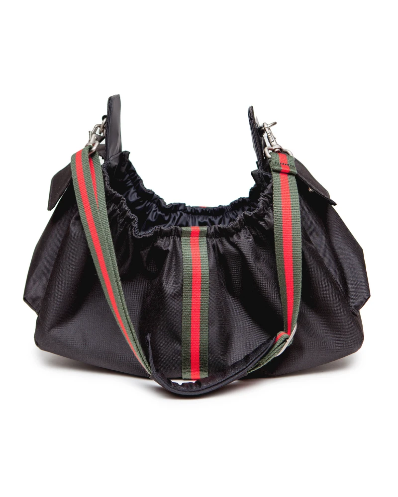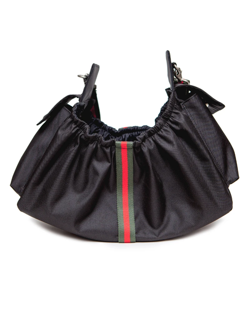 The PETOTE Gigi Sling is a delight to use for small dogs for fast errands around town. The wide open top and shallow depth (only about 6″ high at rest) are perfect for seasoned dogs who know the drill. There’s an elastic band running through the top to provide styling and keep the perfect shape while in use by the removable, and adjustable padded shoulder strap.