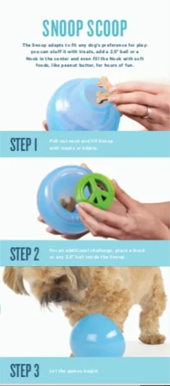 Lil’ Snoop is designed to activate a dog’s mind and energize its play. Snoop’s flexible opening pops out for easy loading and cleaning. Although Snoop is built for durability, it’s intended for puzzle-play, not chewing, so it is not rated on PLANET DOG’s Durability Scale. Snoop is not to be left with dogs unattended.