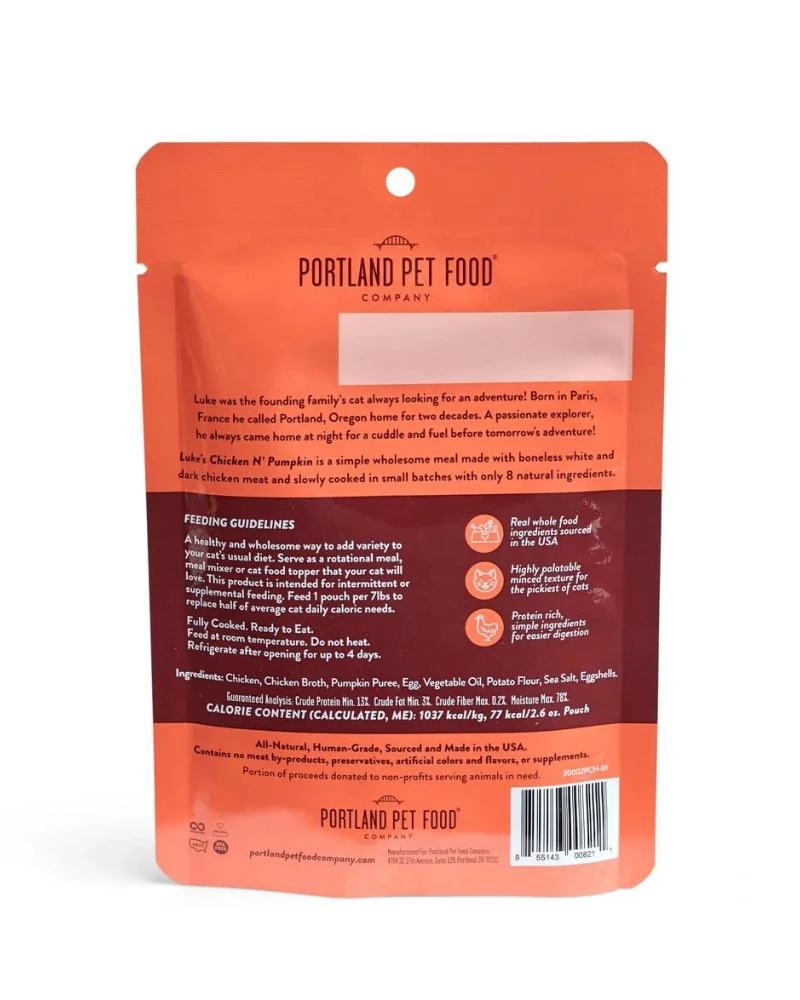 All of PORTLAND PET FOOD’s meals are 100% natural, USA sourced and made, ready-to-eat homestyle cat meals. Their meals are sourced from human-grade, all natural meat raised without antibiotics or hormones so you can add variety and flavor to your cat’s diet with our shelf stable, homestyle meals & toppers. Their pouches are shelf-stable for two years, Earth friendly, and BPA free so you can feel good while your cat eats well.