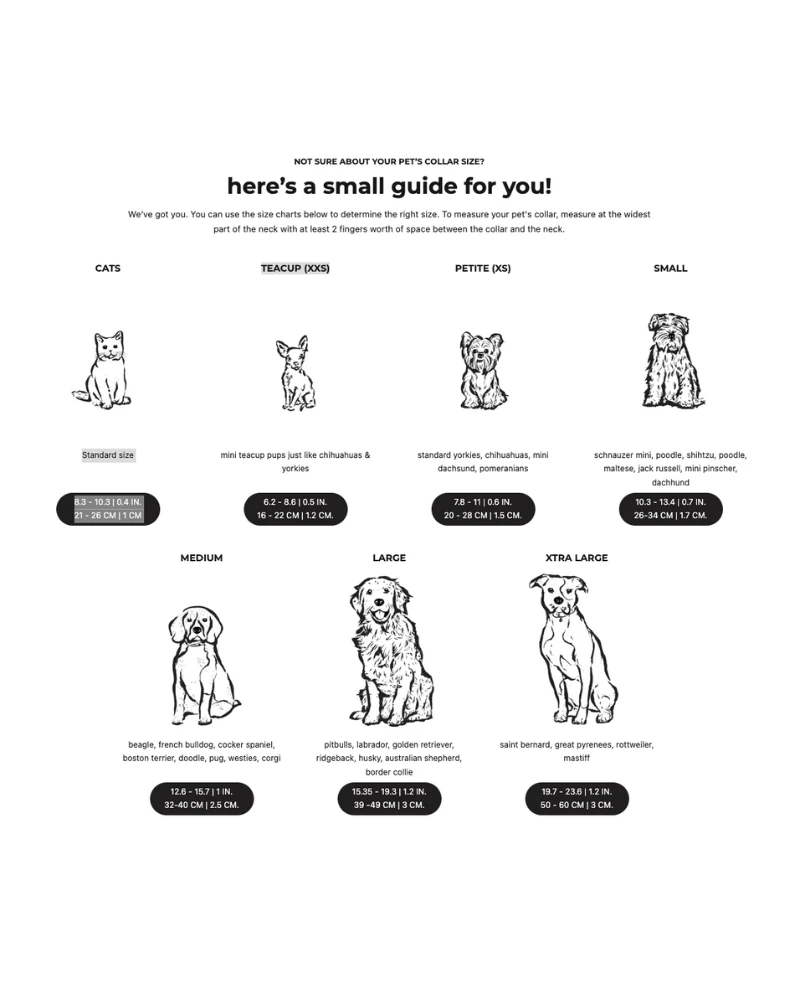 - X-Small : 7.8-11″ / 0.6″ wide (Yorkies, Chihuahuas, Poms)