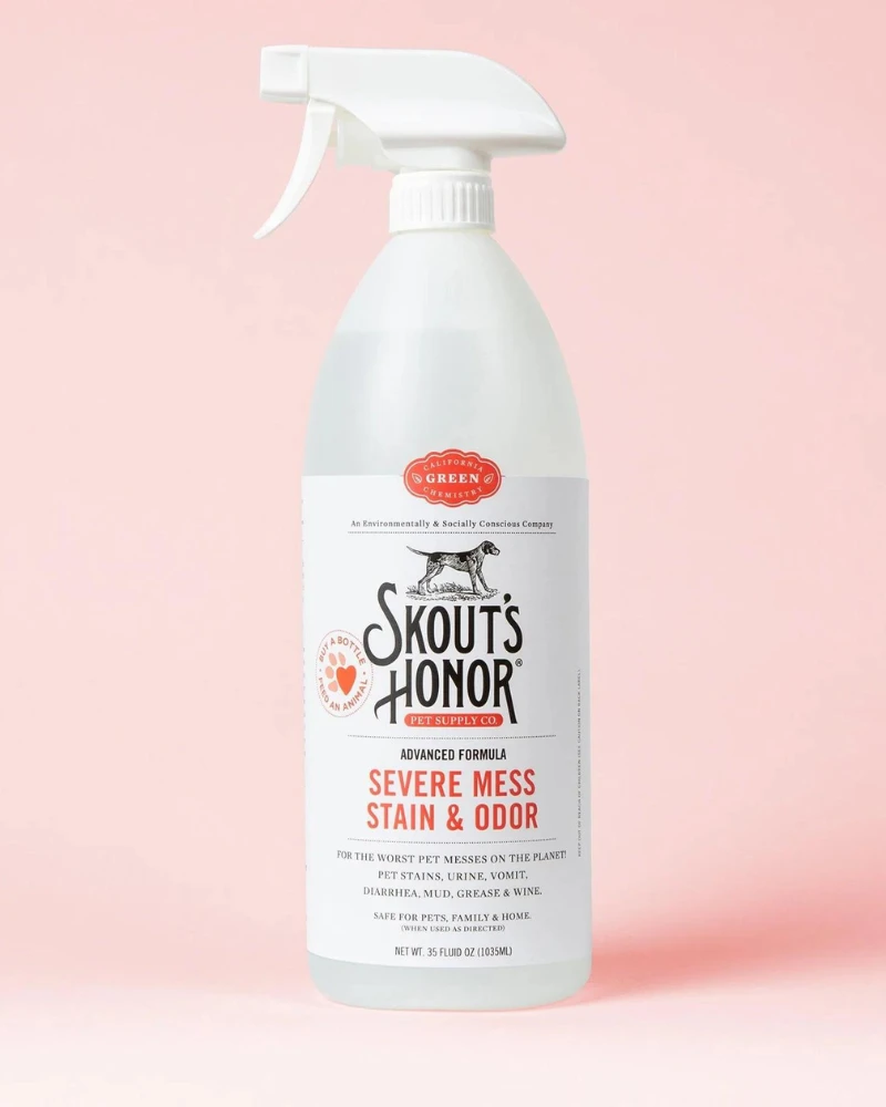 SKOUT’S HONOR’s most powerful stain and odor solution, designed to tackle the worst pet messes on the planet including urine, vomit, diarrhea, mud, grease, wine, etc.