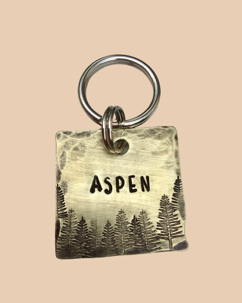 Brass, Bronze, and Copper will darken with age. Aluminum will retain it’s silvery shine without oxidization. This tag will come with a sturdy double ring attached, ready to attach and play!