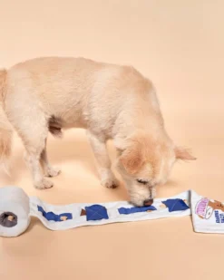 The toilet paper Nosework toy is designed for dogs to use their sense of smell to find tasty treats, providing a play culture that reduces stress and promotes healthy play.